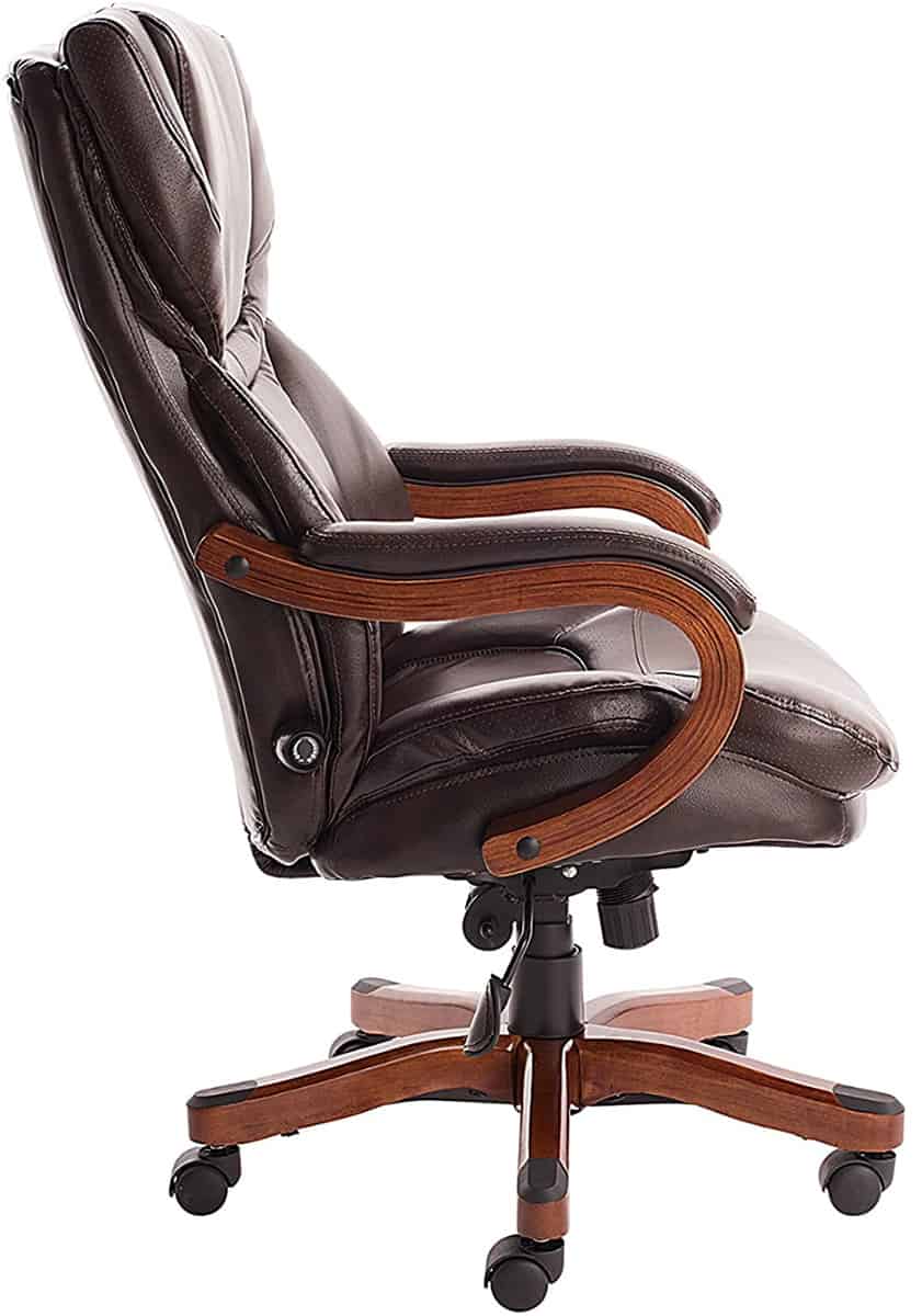 It also has a bigger weight limit than other chairs, 350 lbs to be exact, which is great. The 5-star real wooden base gives this chair a sturdy feel and a balance to support that weight limit. The overall build quality is surprisingly good for a “budget” executive chair.